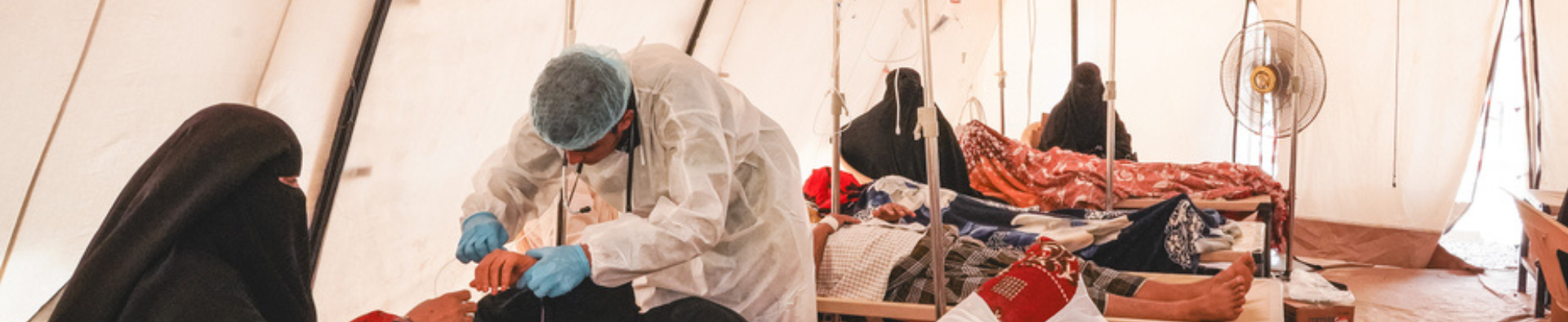 写真上:イエメンのコレラ治療センター(CTC)で患者の対応にあたるMSFスタッフ © Athmar Mohammed/MSF