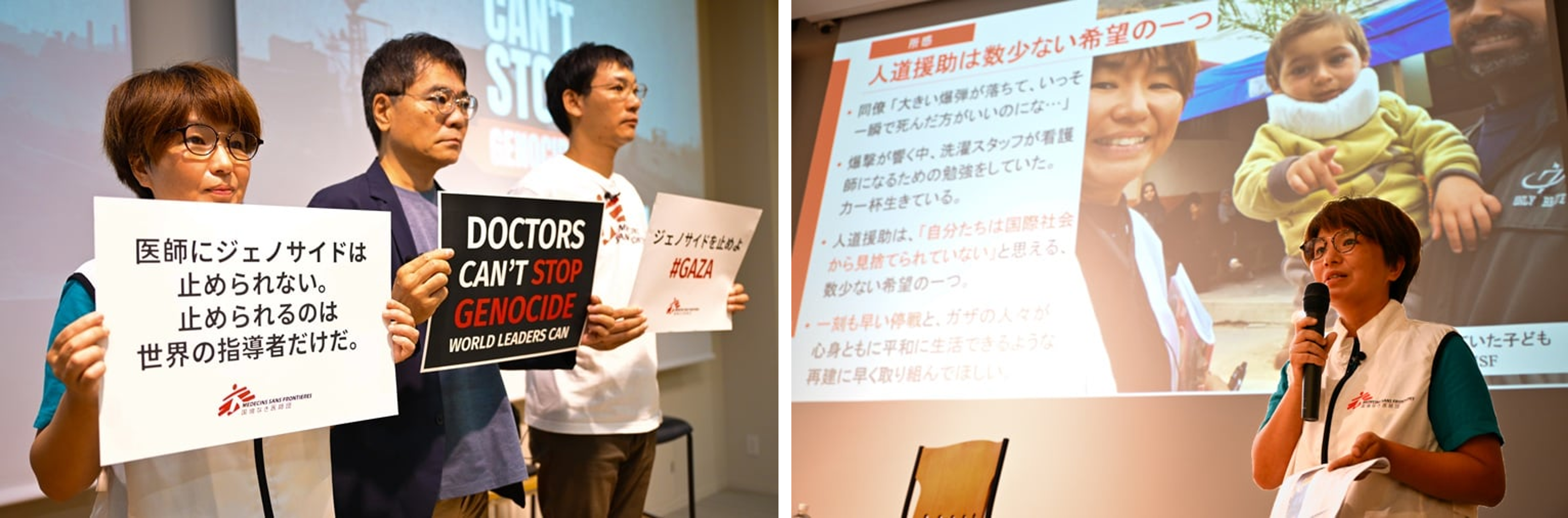 パレスチナ・ガザ地区で紛争が激化してから2年。 現地の状況が悪化の一途をたどる中、MSFは10月3日ガザ地区から帰ってきた日本人の海外派遣スタッフらによる活動報告会をカタログハウス(東京都渋谷区)のセミナーホールで開催しました。2019年にガザ地区を訪れた作家・クリエイターのいとうせいこうさんをゲストに迎え、MSF看護師の中池ともみ、MSFロジスティシャンの松田隆行の3人が、現地で実際に目撃、経験したことや、医療・人道援助の現場で感じた思いを語り合いました。一般参加の約130人が来場。ガザの現実を知り、日本にいる私たちにいま何ができるのか、共に考える時間となりました。