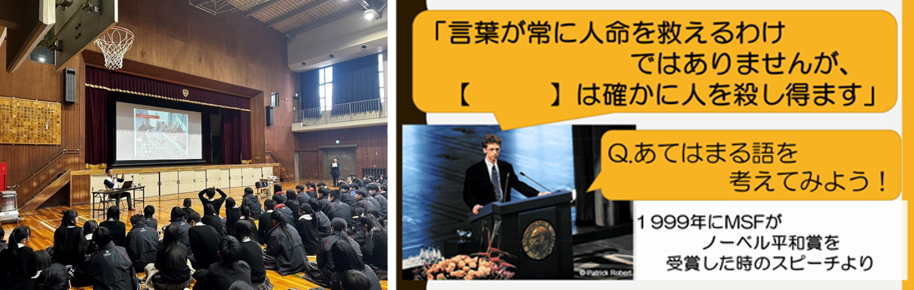 今年度は戦後80年という節目の年であることから、本校では「平和教育」を重点的に学習しています。過去の戦争について学ぶだけでなく、現在、世界で起こっている「平和」をめぐる現状を知り、自分たちにできる役割や行動について主体的に捉えてほしいと考え、最前線で活躍する国境なき医師団に講演を依頼しました。